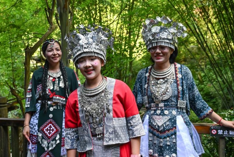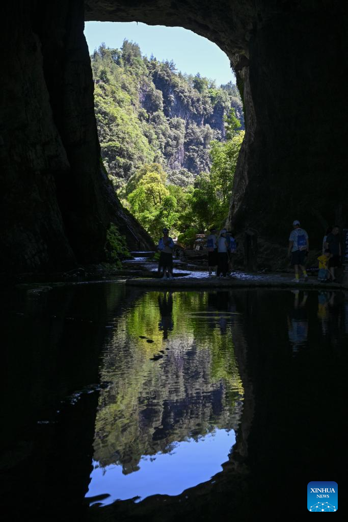 Turistas visitan el punto escénico de Taohuayuan, en el distrito autónomo tujia y miao de Youyang, en la municipalidad de Chongqing, en el suroeste de China, el 5 de julio de 2025. (Xinhua/Chen Cheng)