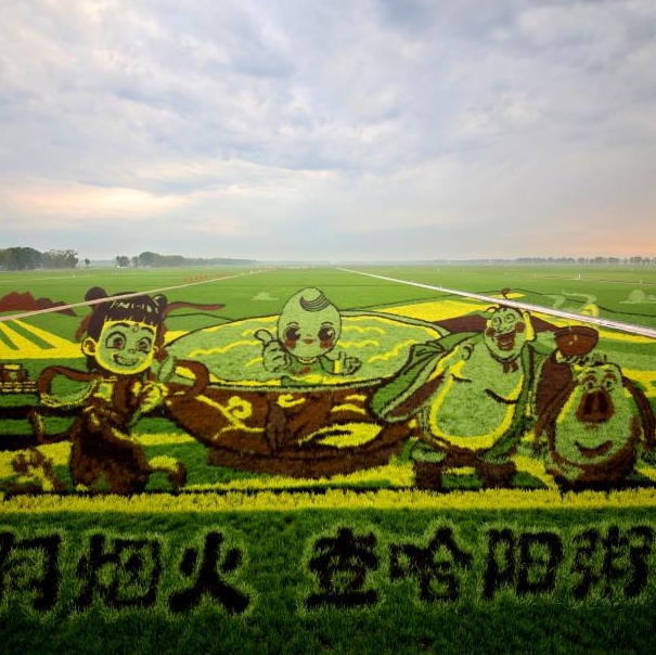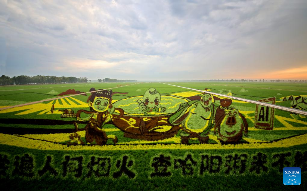 Imagen tomada con un dron el 4 de julio de 2025 de campos de arroz del Grupo Beidahuang, en Qiqihar, en la provincia de Heilongjiang, en el noreste de China. En la actualidad, en las áreas productoras de arroz de la provincia de Heilongjiang, diversas imágenes magníficas de campos de arroz "dibujadas" por diferentes variedades de arroz se despliegan sobre la vasta tierra negra. (Xinhua/Li Zhenquan)