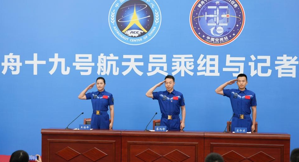 Los astronautas Cai Xuzhe (c), Song Lingdong (d) y Wang Haoze de la misión tripulada Shenzhou-19 de China saludan durante una conferencia de prensa, en Beijing, capital de China, el 9 de julio de 2025. Los astronautas Cai Xuzhe, Song Lingdong y Wang Haoze de la misión tripulada Shenzhou-19 de China se reunieron el miércoles con la prensa, en su primera aparición pública tras regresar a la Tierra en abril. (Xinhua/Li Yanchen)