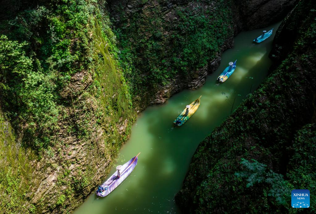 Una foto tomada por un dron el 9 de julio de 2025 muestra a turistas disfrutando de la vista del cañón Pingshan en el condado de Hefeng, Enshi Tujia y la prefectura autónoma de Miao, provincia central de Hubei, China. El paisaje único y el agua limpia hacen del cañón Pingshan un destino atractivo para los turistas.