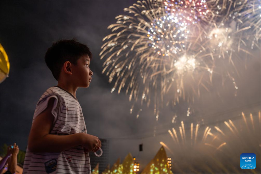 Una turista disfruta de un espectáculo de fuegos artificiales creativos en la ciudad de Liuyang, provincia central china de Hunan, el 12 de julio de 2025. (Xinhua/Chen Sihan.)