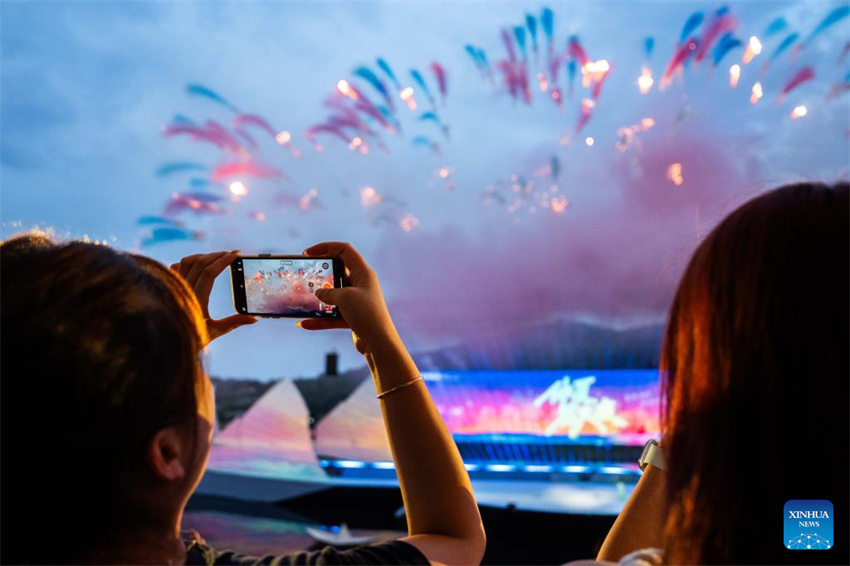 Turistas animan durante un espectáculo de fuegos artificiales creativos en la ciudad de Liuyang, provincia central china de Hunan, el 12 de julio de 2025. (Xinhua/Chen Sihan.)