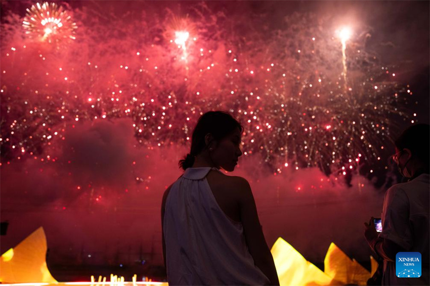 Turistas toman fotos durante un espectáculo de fuegos artificiales creativos en la ciudad de Liuyang, provincia central china de Hunan, el 12 de julio de 2025. (Xinhua/Chen Sihan.)