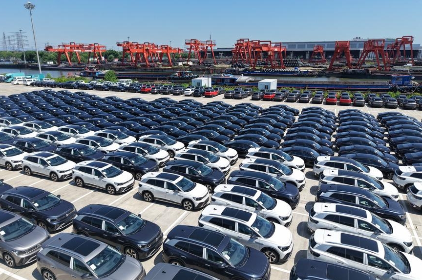 Una foto de dron tomada el 29 de junio de 2025 muestra vehículos de nueva energía estacionados en una terminal de exportación de vehículos en la sección de Hangzhou del Gran Canal Beijing-Hangzhou en Hangzhou, provincia de Zhejiang, en el este de China. (Foto de Long Wei/Xinhua).
