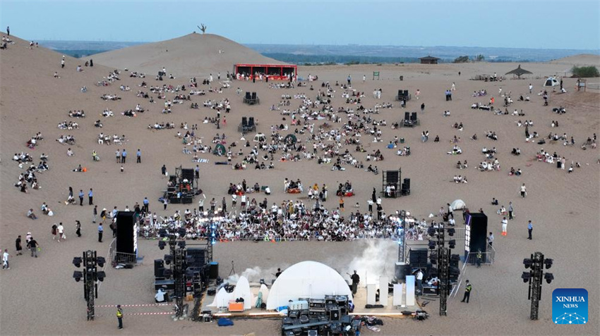 Una foto aérea tomada por un dron el 13 de julio de 2025 muestra a gente disfrutando de una actuación en una zona panorámica de Yinchuan, en la región autónoma de la etnia Hui de Ningxia, en el noroeste de China. (Xinhua/Wang Peng.)