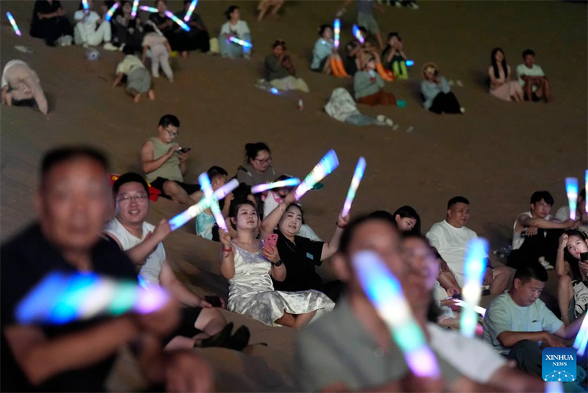 Un grupo de personas disfruta de una actuación en una zona escénica de Yinchuan, en la región autónoma de la etnia Hui de Ningxia, en el noroeste de China, el 13 de julio de 2025. (Xinhua/Wang Peng.)