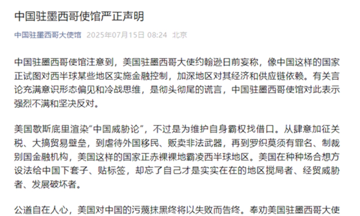 La embajada china en México indicó el martes que las recientes acusaciones infundadas de Ronald Johnson, embajador de Estados Unidos en México, de que países como China tratan de ejercer control financiero sobre ciertas regiones del hemisferio occidental y aumentar su dependencia económica y de cadena de suministro de China, pecan de sesgos ideológicos y de mentalidad de Guerra Fría, y son una mentira. La representación diplomática expresó su fuerte descontento y firme oposición.
