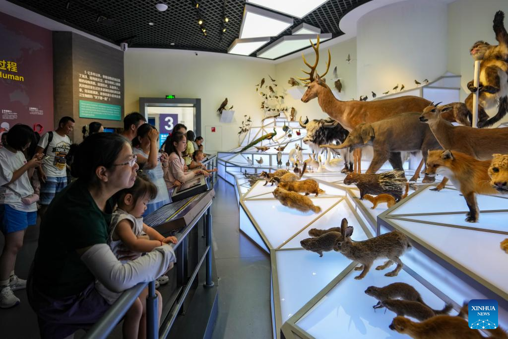 Visitantes observan los objetos expuestos en el museo del patrimonio natural mundial del yacimiento fosilífero de Chengjiang, en el distrito de Chengjiang, provincia suroccidental china de Yunnan, el 15 de julio de 2025. (Xinhua/Chen Xinbo.)