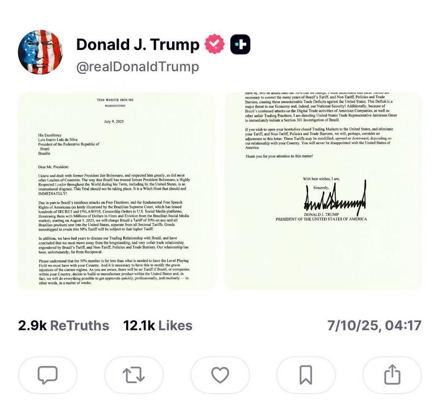 Captura de la carta, fechada el 9 de julio de 2025, del presidente estadounidense, Donald Trump, a su homólogo brasileño, Luiz Inácio Lula da Silva.