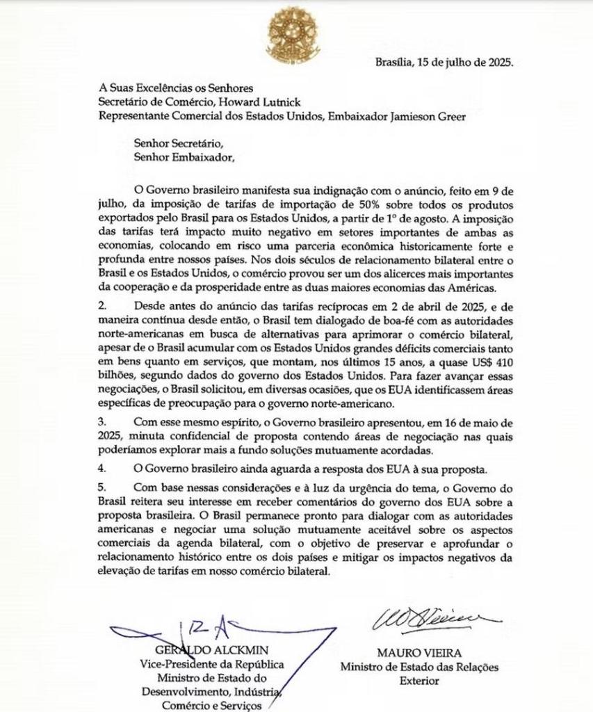La carta, firmada por el vicepresidente y titular de la cartera de Fomento, Geraldo Alckmin, así como por el ministro de Relaciones Exteriores, Mauro Vieira, advierte de que los nuevos aranceles "tendrán un impacto muy negativo en importantes sectores de ambas economías, poniendo en peligro la sólida y profunda alianza económica entre nuestros países".