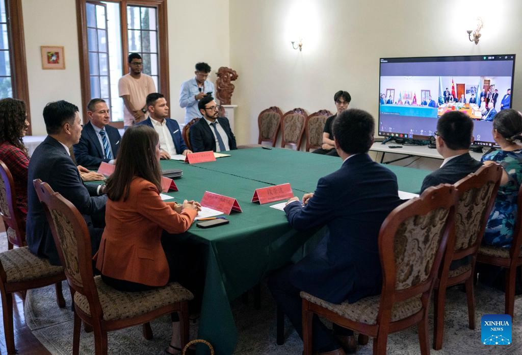 Imagen del 17 de julio de 2025 del embajador de China en Honduras, Yu Bo (2-i), participando junto a autoridades hondureñas e invitados en un acto virtual para la firma del contrato de adquisición de 3.000 toneladas de camarón hondureño, en la sede de la Embajada de la República Popular China en Honduras, en Tegucigalpa, capital de Honduras. Empresas chinas y hondureñas firmaron esta semana un acuerdo para la exportación de 3.000 toneladas de camarón hondureño al mercado chino, en una muestra del creciente dinamismo económico entre ambos países, tras el establecimiento de relaciones diplomáticas en 2023. (Xinhua/David de la Paz)