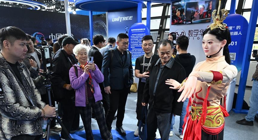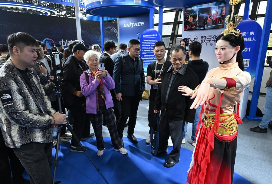 Un robot humanoide (d) interactúa con visitantes en la Exposición Luz de la Internet, en Wuzhen, en la provincia de Zhejiang, en el este de China, el 19 de noviembre de 2024. (Xinhua/Li He)