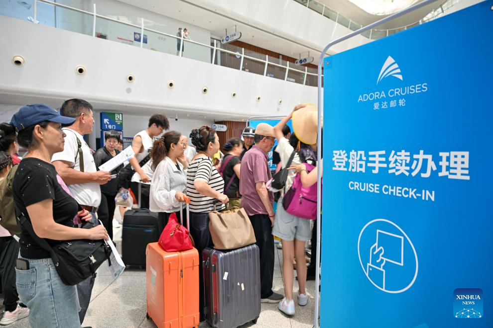 Viajeros se registran en el Puerto Base de Cruceros Internacionales de Tianjin, en Tianjin, en el norte de China, el 23 de julio de 2025. Según datos oficiales, el puerto de cruceros de Tianjin ha facilitado la entrada y salida de casi 40.000 pasajeros desde julio de este año, junto con 16 visitas de cruceros, lo que marca un aumento interanual del 17 por ciento. (Xinhua/Sun Fanyue)