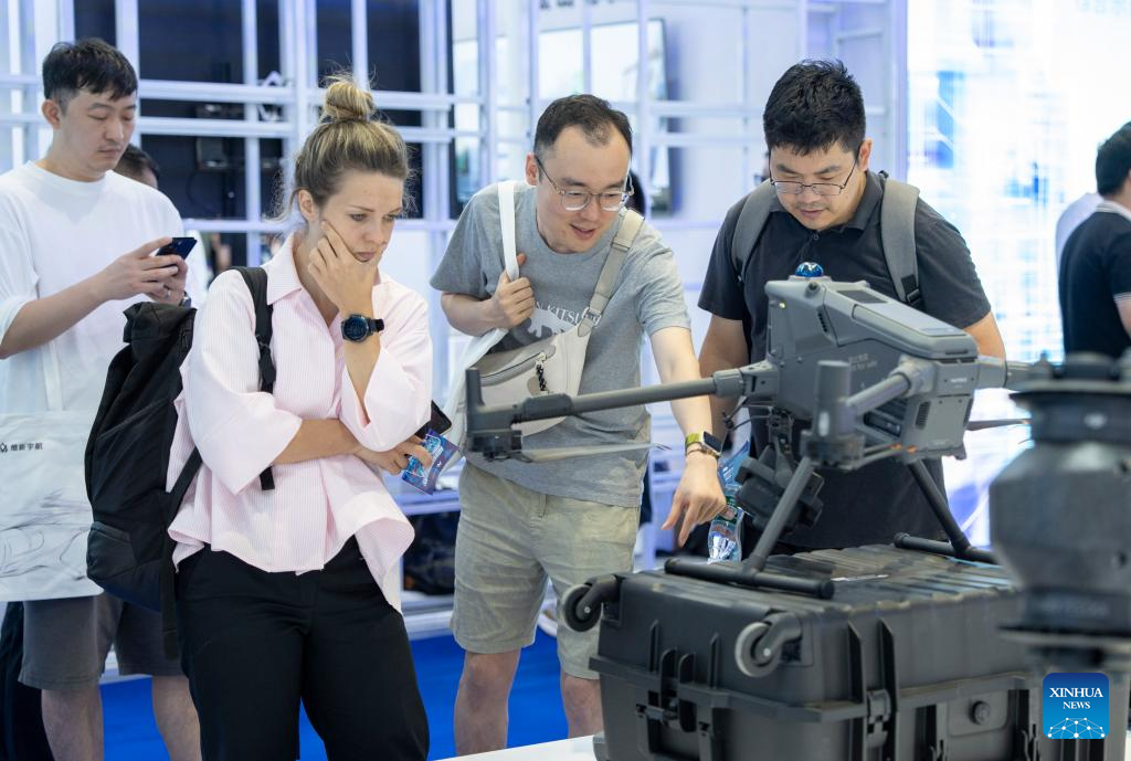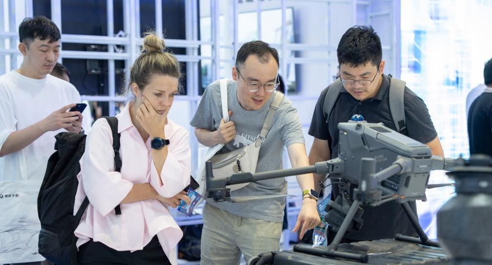 Visitantes conocen sobre un dron en la Exposición Internacional de Movilidad Aérea Avanzada, en Shanghai, en el este de China, el 23 de julio de 2025. La exposición se celebra aquí del 23 al 26 de julio, donde cerca de 300 expositores muestran su infraestructura de baja altitud, así como sus servicios de fabricación y de apoyo. (Xinhua/Zhang Yue)