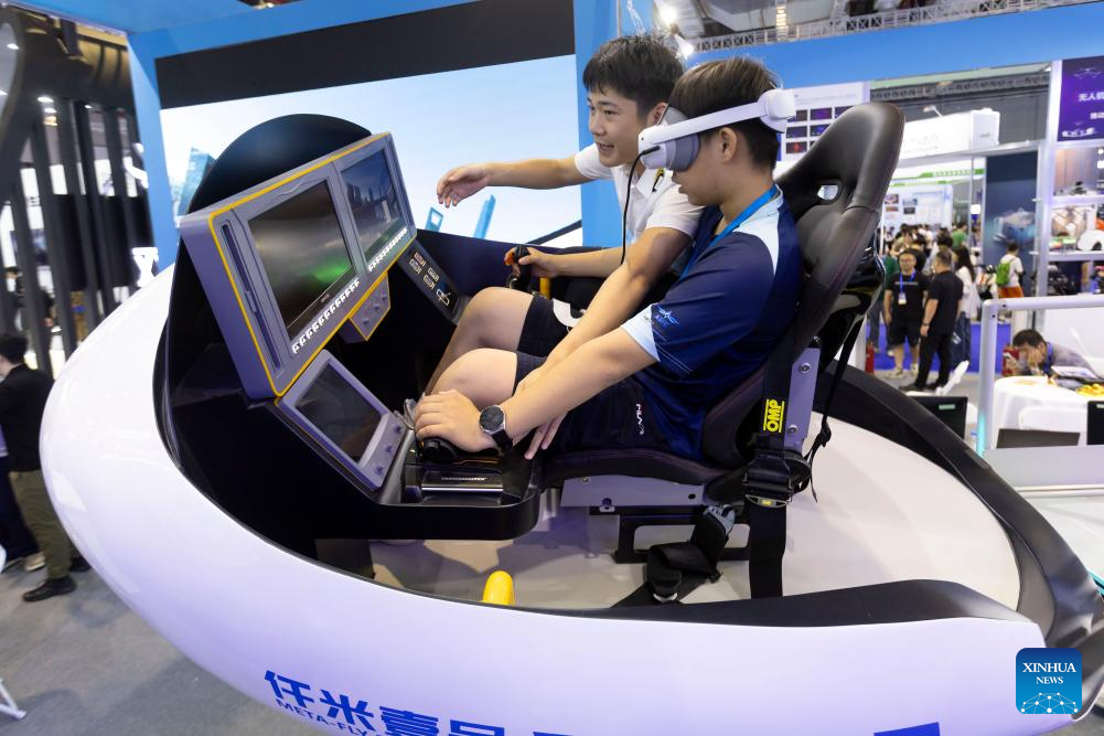 Un visitante prueba un vuelo simulado bajo la guía de un empleado en la Exposición Internacional de Movilidad Aérea Avanzada, en Shanghai, en el este de China, el 23 de julio de 2025. La exposición se celebra aquí del 23 al 26 de julio, donde cerca de 300 expositores muestran su infraestructura de baja altitud, así como sus servicios de fabricación y de apoyo. (Xinhua/Wang Xiang)