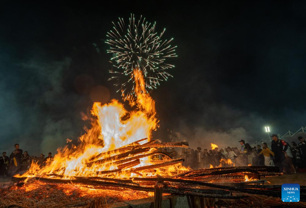 Imagen del 22 de julio de 2025 de turistas y residentes bailando alrededor de una hoguera en un festival de antorchas, en el distrito de Butuo, en la provincia de Sichuan, en el suroeste de China. Un festival tradicional de antorchas del grupo étnico yi se celebró aquí del 21 al 23 de julio, con diversas actividades que incluyeron exhibiciones de disfraces, fiesta con fogatas, eventos deportivos étnicos tradicionales, concurso de baile y belleza tradicional. (Xinhua/Jiang Hongjing)