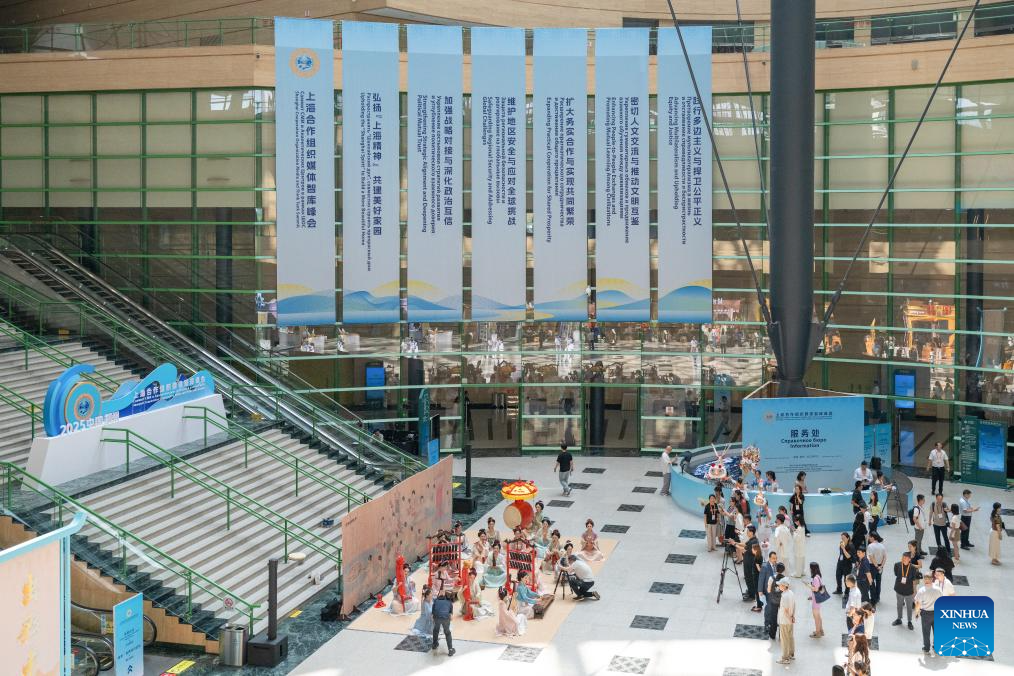 Trabajadores de los medios de comunicación toman fotografías de un espectáculo de música folclórica que reproduce la escena de una antigua pintura china en la sede de la Cumbre de Medios de Comunicación y Think Tanks de la Organización de Cooperación de Shanghai (OCS), en Zhengzhou, en la provincia de Henan, en el centro de China, el 24 de julio de 2025. Con el lema "Defender el 'Espíritu de Shanghai' para construir un hogar más hermoso", la Cumbre de Medios de Comunicación y Think Tanks de la OCS se realiza aquí del 23 al 27 de julio. (Xinhua/Wu Jingdan)