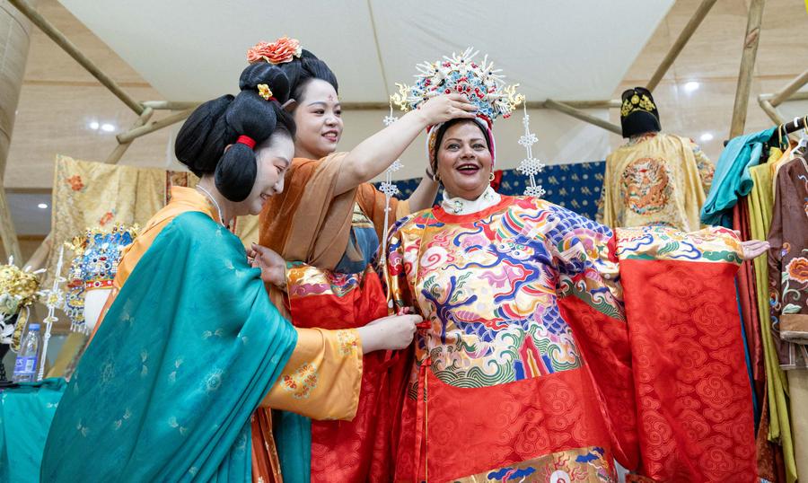 Una participante (d) de la Cumbre de Medios de Comunicación y Think Tanks de la Organización de Cooperación de Shanghai (OCS) se prueba un atuendo tradicional chino en la sede de la cumbre, en Zhengzhou, en la provincia de Henan, en el centro de China, el 25 de julio de 2025. (Xinhua/Bai Xueqi)