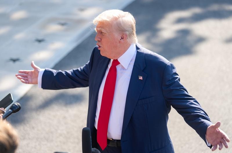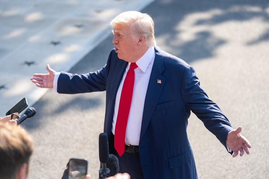 El presidente estadounidense, Donald Trump, habla ante reporteros previo a su partida hacia Reino Unido, en la Casa Blanca, en Washington D. C., Estados Unidos, el 25 de julio de 2025. (Xinhua/Hu Yousong)