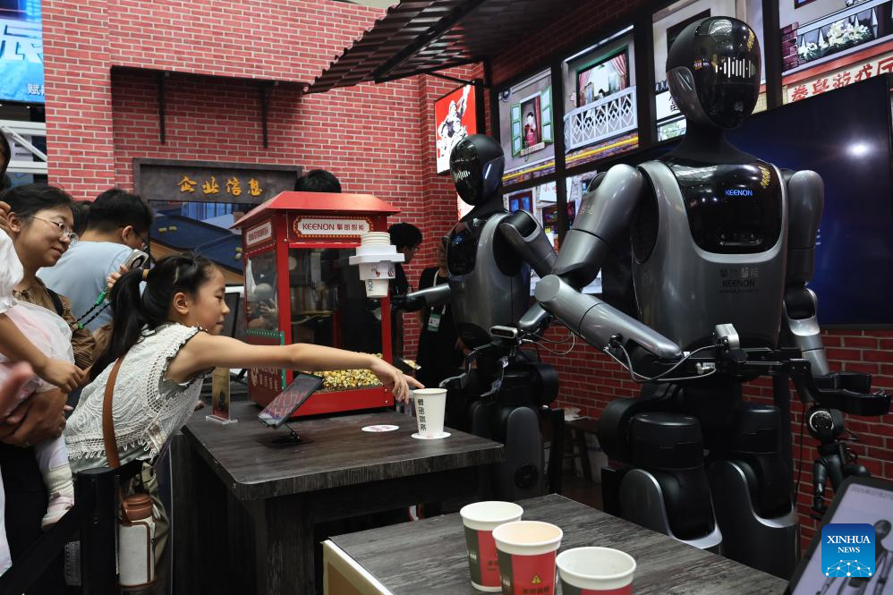 Robots humanoides sirven palomitas de maíz y bebidas en la Conferencia Mundial sobre IA 2025, en Shanghai, en el este de China, el 27 de julio de 2025. La Conferencia Mundial sobre IA 2025 en curso muestra los últimos avances en IA del mundo y, al mismo tiempo, proporciona una plataforma para que los visitantes accedan a productos y tecnologías de IA. (Xinhua/Fang Zhe)