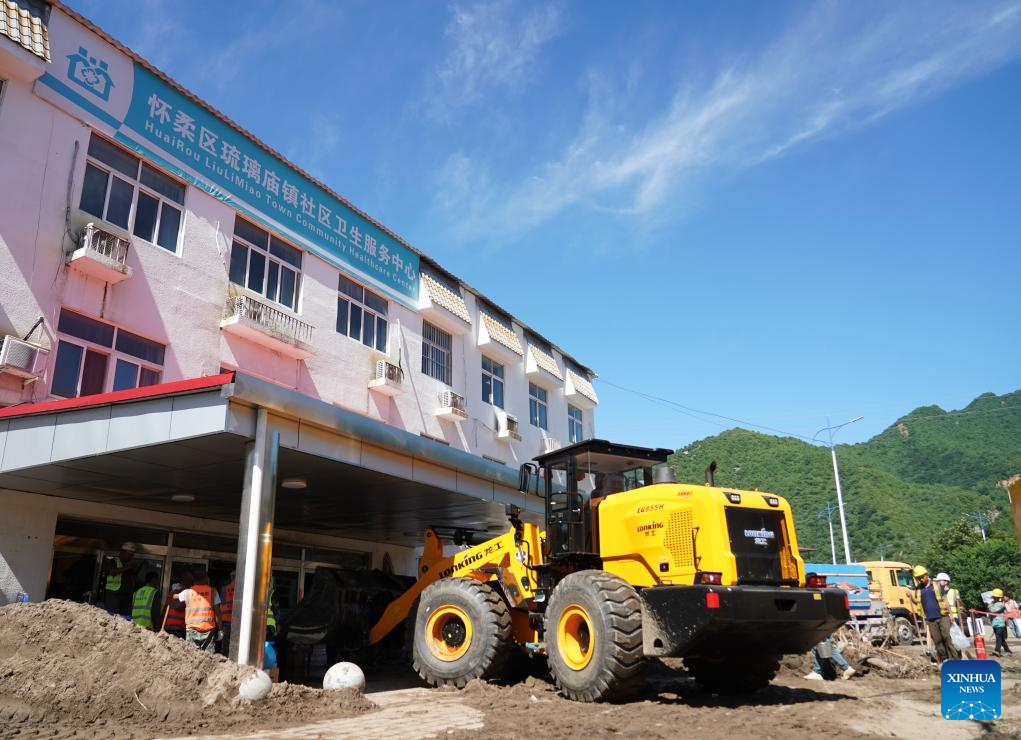 Rescatistas retiran limo en una clínica comunitaria, en el poblado de Liulimiao del distrito de Huairou, en Beijing, capital de China, el 30 de julio de 2025. Las recientes lluvias torrenciales han causado daños a casas y carreteras en múltiples ubicaciones en el distrito de Huairou. En el poblado de Liulimiao, una de las áreas más afectadas en Huairou, los equipos de rescate están evacuando ordenadamente a los residentes varados y despejando sitios dañados. (Xinhua/Zhang Chenlin)