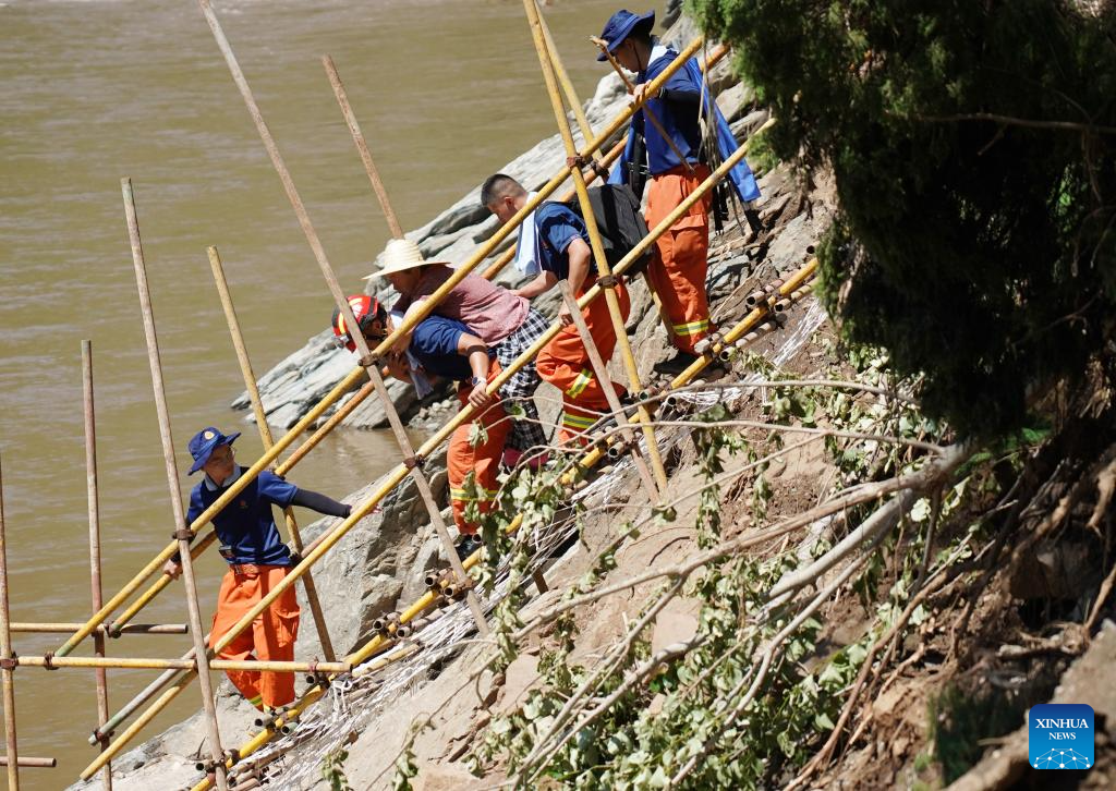 Rescatistas trasladan a residentes varados, en el poblado de Liulimiao del distrito de Huairou, en Beijing, capital de China, el 30 de julio de 2025. Las recientes lluvias torrenciales han causado daños a casas y carreteras en múltiples ubicaciones en el distrito de Huairou. En el poblado de Liulimiao, una de las áreas más afectadas en Huairou, los equipos de rescate están evacuando ordenadamente a los residentes varados y despejando sitios dañados. (Xinhua/Zhang Chenlin)