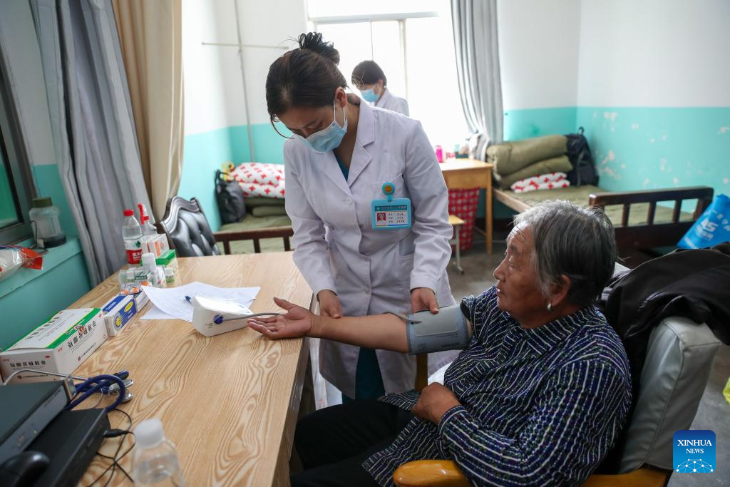 Una trabajadora médica mide la presión arterial de una aldeana en una escuela convertida en un sitio de reasentamiento temporal, en el municipio de Gaoya del condado de Yuzhong, en la ciudad de Lanzhou, en la provincia de Gansu, en el noroeste de China, el 9 de agosto de 2025. El sitio de reasentamiento temporal ha recibido a más de 170 habitantes de la aldea de Maliantan, proporcionando dormitorios, ropa de cama, alimentos, agua potable, medicamentos y otros artículos de primera necesidad para apoyar la vida de los aldeanos afectados por las inundaciones. Las labores de rescate siguen en marcha luego de que lluvias fuertes y continuas provocaran torrentes de montaña en el condado de Yuzhong. Un total de 9.828 habitantes de Yuzhong han sido reubicados en zonas seguras y 443 personas de las que quedaron atrapadas han sido rescatadas, de acuerdo con una conferencia de prensa ofrecida por el Gobierno provincial el viernes por la noche. (Xinhua/Lang Bingbing)