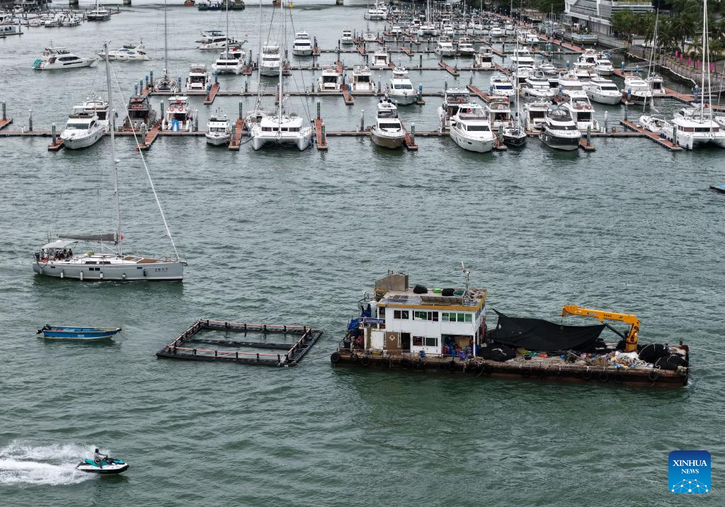 Vista aérea tomada con un dron el 23 de agosto de 2025 de barcos regresando a un muelle, en Sanya, en la provincia de Hainan, en el sur de China. China activó el sábado una respuesta de emergencia de nivel IV por posibles inundaciones e impacto de tifón en la provincia de Hainan, ante la cercanía de Kajiki, el decimotercer tifón de este año, informó el Ministerio de Gestión de Emergencias. (Xinhua/Zhao Yingquan)