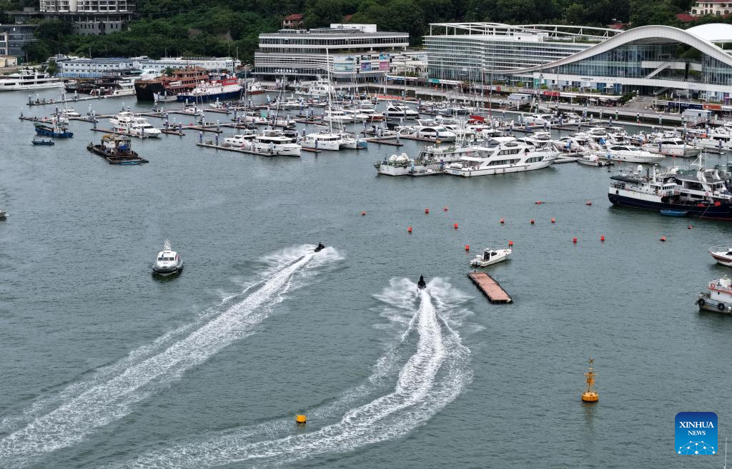 Vista aérea del 23 de agosto de 2025 de yates regresando a un muelle, en Sanya, en la provincia de Hainan, en el sur de China. China activó el sábado una respuesta de emergencia de nivel IV por posibles inundaciones e impacto de tifón en la provincia de Hainan, ante la cercanía de Kajiki, el decimotercer tifón de este año, informó el Ministerio de Gestión de Emergencias. (Xinhua/Zhao Yingquan)