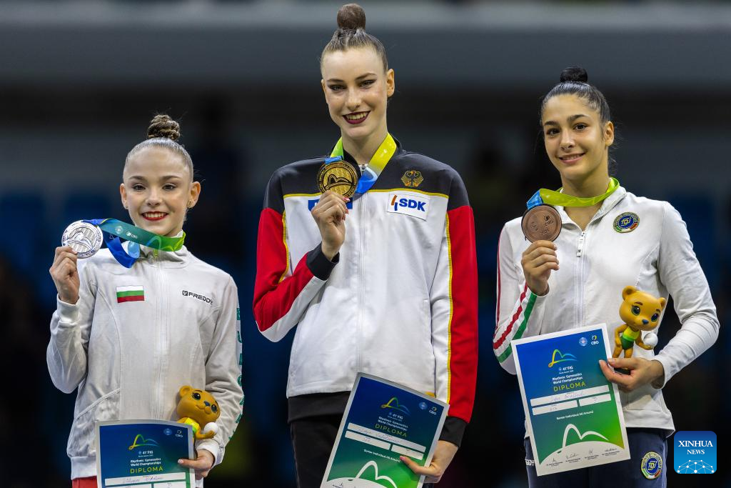 Imagen del 22 de agosto de 2025 de la medallista de oro Darja Varfolomeev (c), de Alemania, la medallista de plata Stiliana Nikolova (i), de Bulgaria, y la medallista de bronce Sofia Raffaeli, de Italia, posando con sus medallas para una fotografía durante la ceremonia de premiación de las finales del concurso completo individual durante el 41 Campeonato Mundial de Gimnasia Rítmica de la FIG, en Río de Janeiro, Brasil. (Xinhua/Claudia Martini)