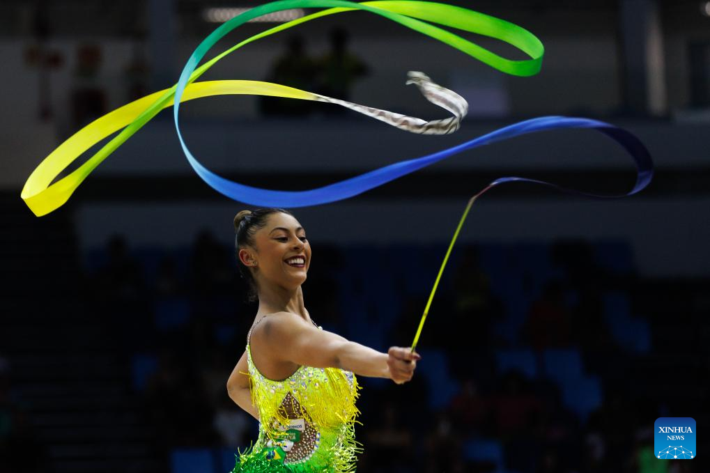 Imagen del 22 de agosto de 2025 de Bárbara Domingos, de Brasil, compitiendo en el evento de cinta de las finales del concurso completo individual durante el 41 Campeonato Mundial de Gimnasia Rítmica de la FIG, en Río de Janeiro, Brasil. (Xinhua/Claudia Martini)