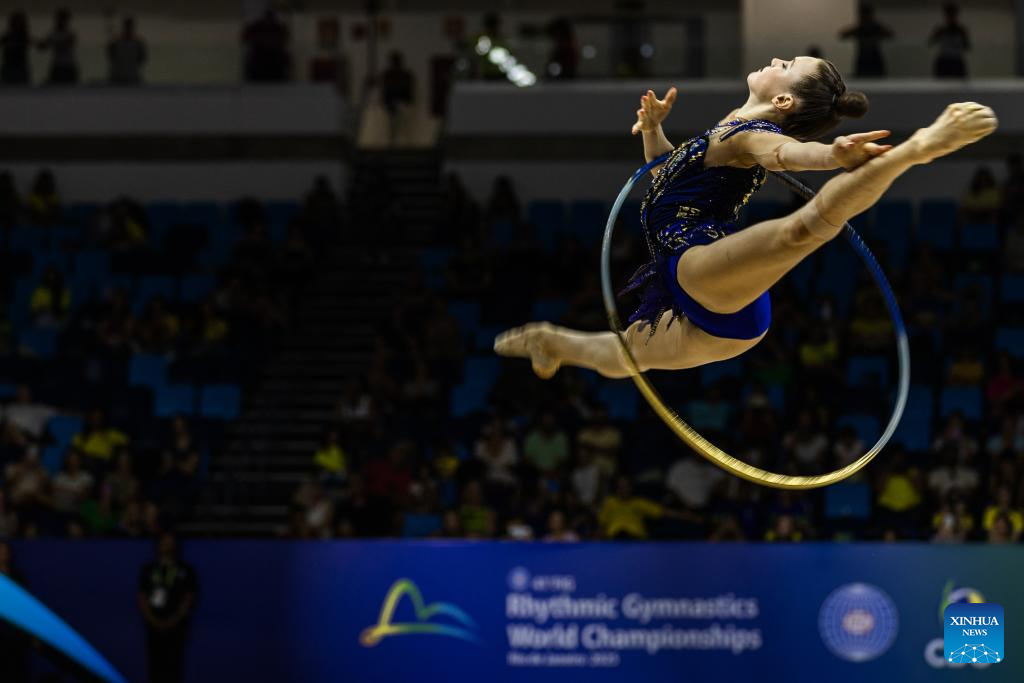 Imagen del 22 de agosto de 2025 de Darja Varfolomeev, de Alemania, compitiendo en el evento de aro de las finales del concurso completo individual durante el 41 Campeonato Mundial de Gimnasia Rítmica de la FIG, en Río de Janeiro, Brasil. (Xinhua/Claudia Martini)