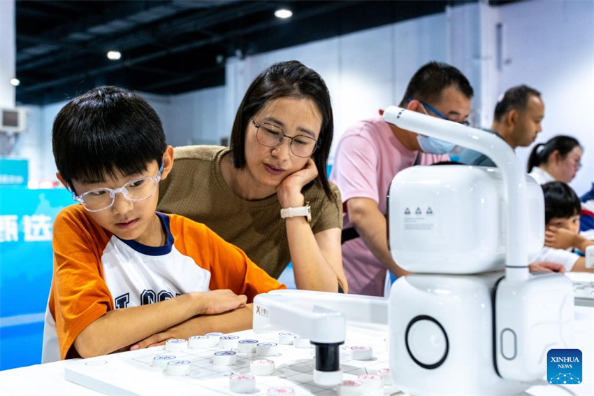 Un niño juega al ajedrez chino contra un robot en una feria del libro en Hohhot, región autónoma de Mongolia Interior, en el norte de China, el 31 de agosto de 2025. (Xinhua/Ma Jinrui.)