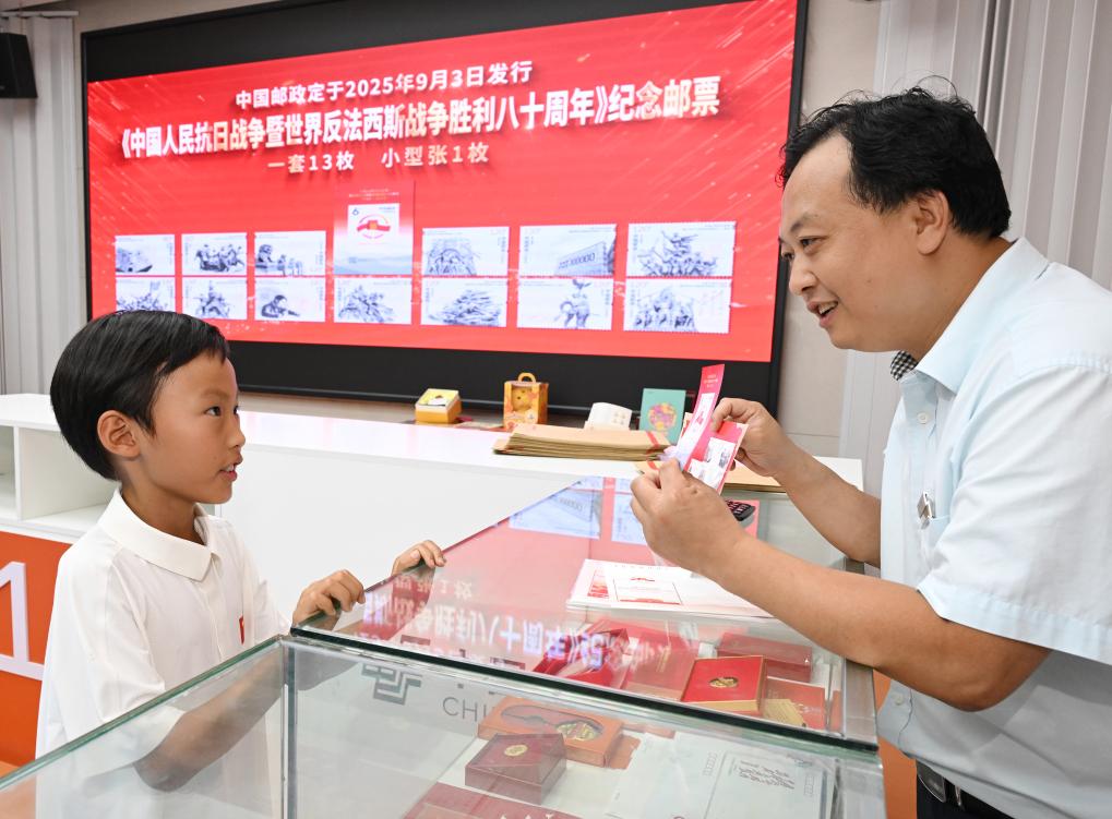 Un empleado presenta los sellos conmemorativos emitidos por el Correo de China para conmemorar el 80º aniversario de la victoria en la Guerra de Resistencia del Pueblo Chino contra la Agresión Japonesa y la Guerra Mundial Antifascista, en una empresa de sellos, en Beijing, capital de China, el 3 de septiembre de 2025. Se emitieron un total de 6 millones de juegos de sellos, cada uno de los cuales contiene 13 sellos. También se emitieron 5 millones de hojas en miniatura. (Xinhua/Li He)