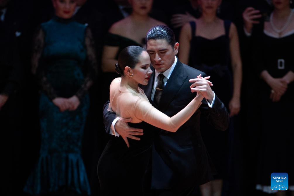 Imagen del 1 de septiembre de 2025 de la pareja integrada por Diego Ortega (d), y Aldana Silveyra (i), bailando tango luego de coronarse campeones en la categoría Pista durante la final del Campeonato Mundial de Tango, en el Teatro Gran Rex, en la ciudad de Buenos Aires, capital de Argentina. Una pareja argentina obtuvo el lunes por la noche la edición número 22 del Campeonato Mundial de Tango en la categoría Pista, estilo en el cual la danza se ajusta al formato popular y tradicional, a diferencia de la versión Escenario, más acrobática y de formato libre, cuyos ganadores se definirán el martes. (Xinhua/Martín Zabala)
