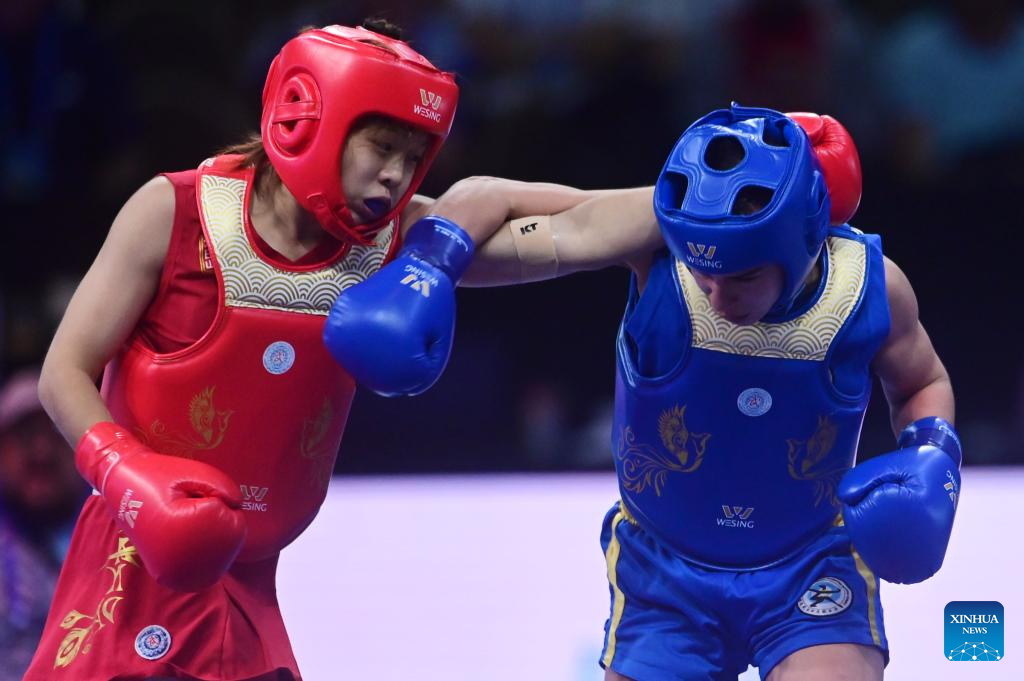 Ching Chan (i), de Hong Kong de China, compite con Nazarena Liliana Roca (d), de Argentina, durante el combate femenino de sanda de -56 kilogramos en el 17 Campeonato Mundial de Wushu, en Brasilia, Brasil, el 3 de septiembre de 2025. (Xinhua/Lucio Tavora)