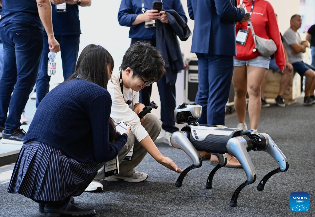 Imagen del 5 de septiembre de 2025 de personas interactuando con un perro robot en la IFA Berlín 2025, en Berlín, Alemania. La IFA Berlín 2025, una de las ferias comerciales más grandes del mundo dedicada a la electrónica de consumo y los electrodomésticos, abrió el viernes, enfocándose en temas orientados al futuro como la tecnología de la información, la inteligencia artificial, el software y la potencia informática, así como soluciones sostenibles para el hogar, la movilidad y el estilo de vida. (Xinhua/Zhang Haofu)