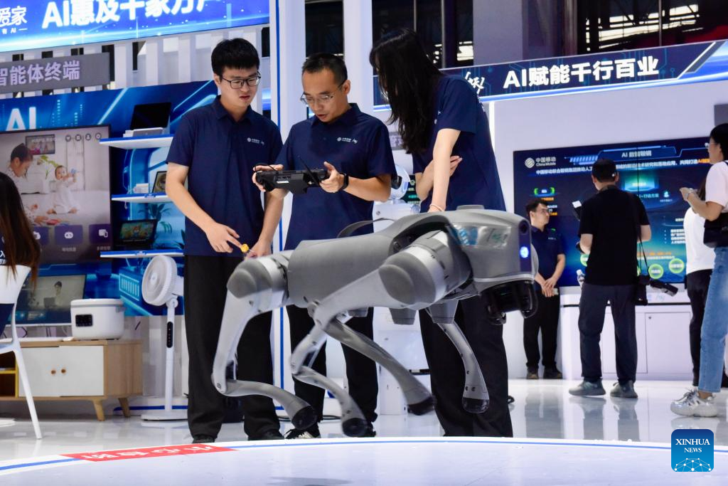 Empleados de China Mobile ajustan un perro robótico en el área de exposiciones de la Conferencia Global de Internet Industrial 2025, en Shenyang, en la provincia de Liaoning, en el noreste de China, el 7 de septiembre de 2025. Con el lema "Nuevo Capítulo Digital, Nueva Calidad Inteligente", la Conferencia Global de Internet Industrial 2025 comenzó aquí el sábado y durará hasta el 8 de septiembre. (Xinhua/Wang Yuyan)