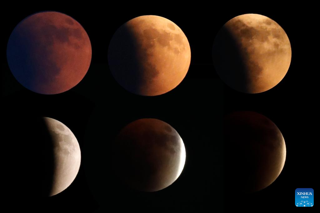Imagen combinada del 7 de septiembre de 2025 del proceso de un eclipse lunar total, en el cielo sobre El Cairo, Egipto. (Xinhua/Ahmed Gomaa)