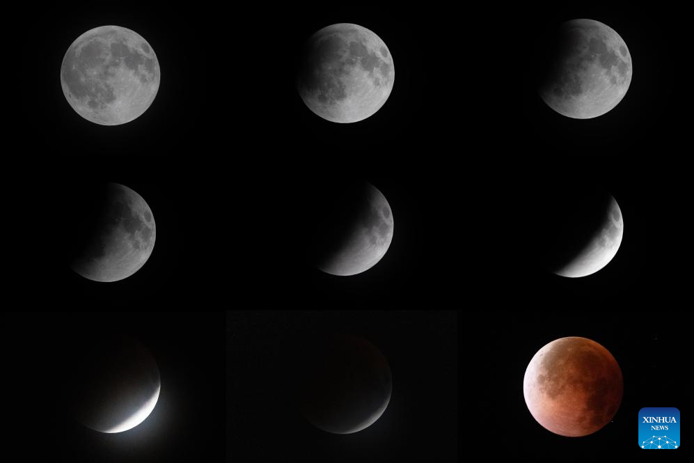 Imagen combinada tomada entre el 7 y el 8 de septiembre de 2025 de un eclipse lunar sobre Nagqu, en la región autónoma de Xizang, en el suroeste de China. (Xinhua/Jiang Fan)