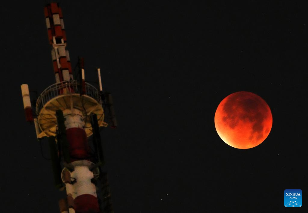 Un eclipse lunar total se produce cuando la Luna y el Sol se encuentran en lados opuestos de la Tierra. (Foto de Zhou Guoqiang/Xinhua.)