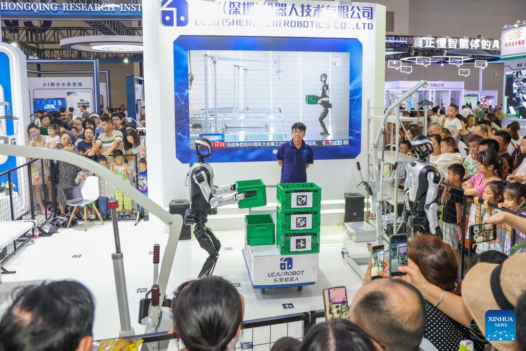 Imagen del 7 de septiembre de 2025 de visitantes observando trabajar a un robot humanoide, en la Exposición Mundial de la Industria Inteligente 2025, en la municipalidad de Chongqing, en el suroeste de China. La Exposición Mundial de la Industria Inteligente 2025 en curso, reúne a más de 600 empresas nacionales e internacionales para presentar tecnologías, productos y escenarios de aplicación en campos de vanguardia. (Xinhua/Huang Wei)