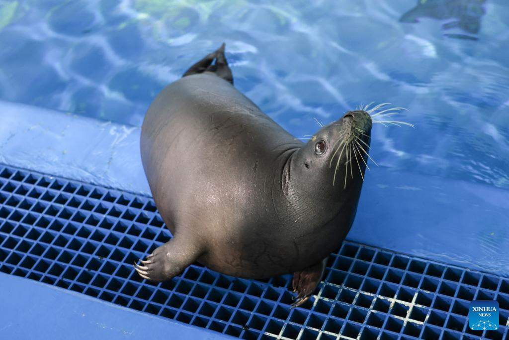 Imagen del 8 de septiembre de 2025 de la foca Anong vista en el Centro de Conservación y Rescate del Océano Azul, en Lingshui, en la provincia de Hainan, en el sur de China. Una foca llamada Anong, conocida por interactuar con los pescadores locales en una playa sin urbanizar del poblado de Dongjiao, en la ciudad de Wenchang, en la provincia de Hainan, fue trasladada a un centro de conservación de fauna acuática en Lingshui para su protección y su regreso a su hábitat en el futuro. (Xinhua/Zhang Liyun)
