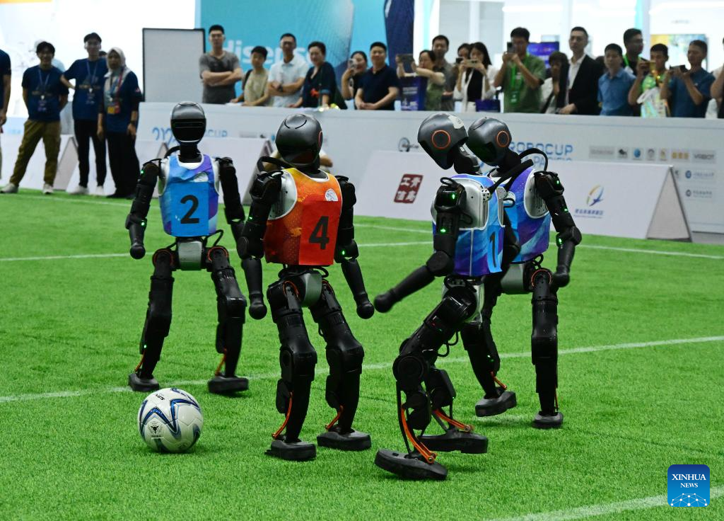 Imagen del 8 de septiembre de 2025 de robots compitiendo durante un partido de fútbol de la Copa Mundial de Robots (RoboCup) del Torneo Invitacional Asia-Pacífico de Qingdao, en Qingdao, en la provincia de Shandong, en el este de China. (Xinhua/Li Ziheng)