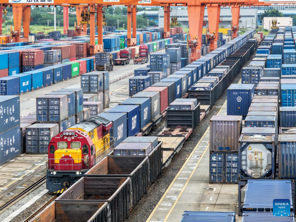 Una foto tomada con un dron el 8 de septiembre de 2025 muestra un tren de mercancías China-Europa esperando para salir de la estación de Tuanjiecun, en Chongqing, suroeste de China. (Xinhua/Tang Yi.)