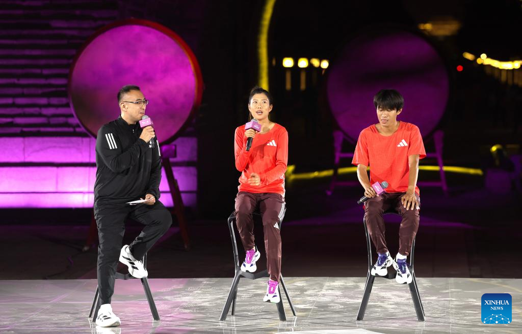 Los atletas chinos de maratón Li Dan (centro) y Chen Yufan (dcha.) asisten a la ceremonia de inauguración del Campo de Entrenamiento del Maratón de Beijing para el próximo Maratón de Beijing 2025 en la capital de China, el 14 de septiembre de 2025. (Xinhua/Bai Xuefei.)