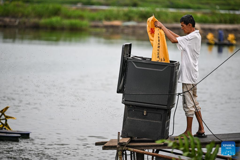 Un aldeano usa un alimentador para dar de comer a los peces en un estanque de cría en la aldea de Jiamei, el 8 de septiembre de 2025. (Xinhua/Pu Xiaoxu.)