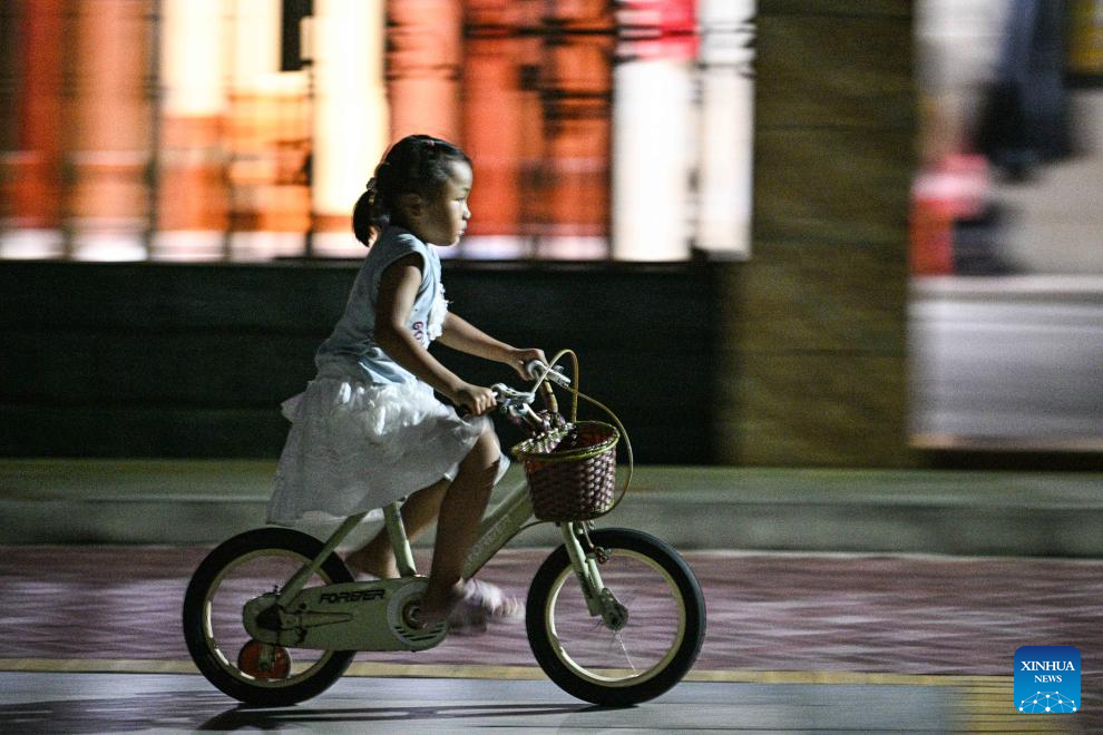 Una niña monta en bicicleta en la aldea de Jiamei, en la ciudad de Wenchang, provincia de Hainan, en el sur de China, el 3 de septiembre de 2025. (Xinhua/Pu Xiaoxu.)