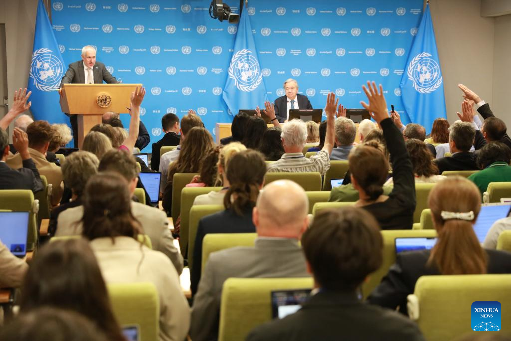 El secretario general de la ONU, António Guterres (d-atrás), sostiene una conferencia de prensa en la sede de la ONU, en Nueva York, el 16 de septiembre de 2025. Guterres indicó el martes que las iniciativas globales propuestas por China son totalmente compatibles con la Carta de las Naciones Unidas. (Xinhua/Xie E)