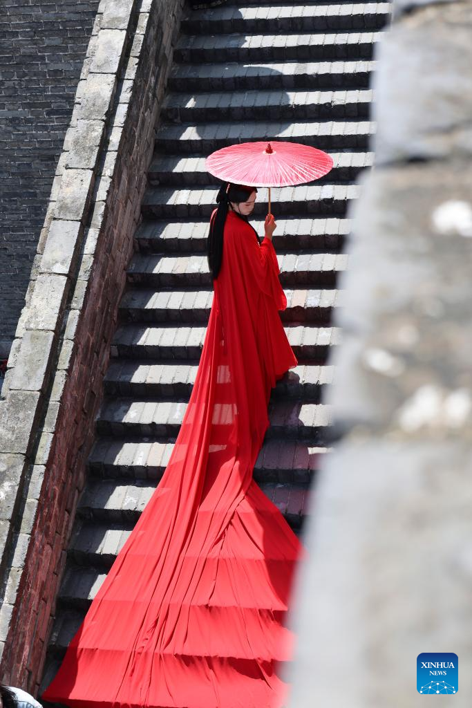 Imagen del 12 de septiembre de 2025 de una turista posando en la antigua muralla de la ciudad, en Xi'an, en la provincia de Shaanxi, en el noroeste de China. La antigua muralla de la ciudad, de 13,74 kilómetros de longitud que rodea Xi'an, es una de las más largas y mejor conservadas de su tipo en China. Una plataforma digital de gestión integral del muro se ha construido desde 2023, e integra funciones como la protección de reliquias culturales, la operación de turismo cultural, la gestión de emergencias y el comando de control de inundaciones. Mediante la aplicación integral de tecnologías avanzadas, como el análisis de macrodatos, Internet de las Cosas, etc., la plataforma brinda una fundación inteligente y digital para la protección de esta histórica ciudad. (Xinhua/Zhu Wiexi)